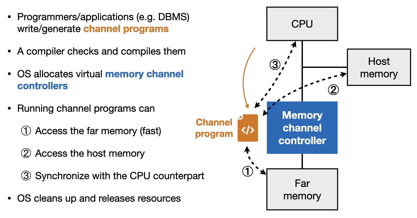 The MCC acts as a programmable unit that sits between the CPU and far memory. Instead of the CPU fetching data byte-by-byte (and stalling on latency), the application sends Channel Programs to the MCC. By executing logic directly next to the data, the MCC eliminates costly round-trips over the CXL link, hiding the high latency of far memory while freeing up the host CPU for other tasks.